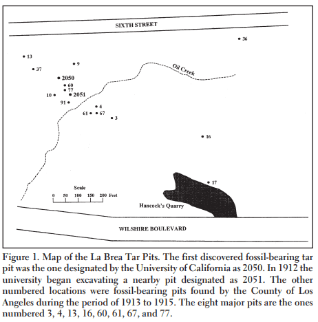 At this point the historical record becomes a little obscure. Someone, we do not know who, made a momentous discovery. About two hundred yards northwest of the quarry was a pocket of densely packed animal and bird bones, broken twigs, and a few large branches of trees (Stoner, 1913). It was located in an area where, several decades previously (according to field excavation notes), Hancock’s laborers had used dynamite to break through the hard bituminous layer to see if there was any commercial grade asphaltum underneath. What made this pocket so desirable, from a fossil extraction point of view, was its soft matrix of tar and sand. It was a relatively easy task to remove the bones, piece by piece, clean them off with kerosene, and analyze them. This discovery, which was later given the name University of California Locality 2050 (Figure 1), brought to light for the first time the paleontological phenomenon that has since been termed “the La Brea Tar Pits.”